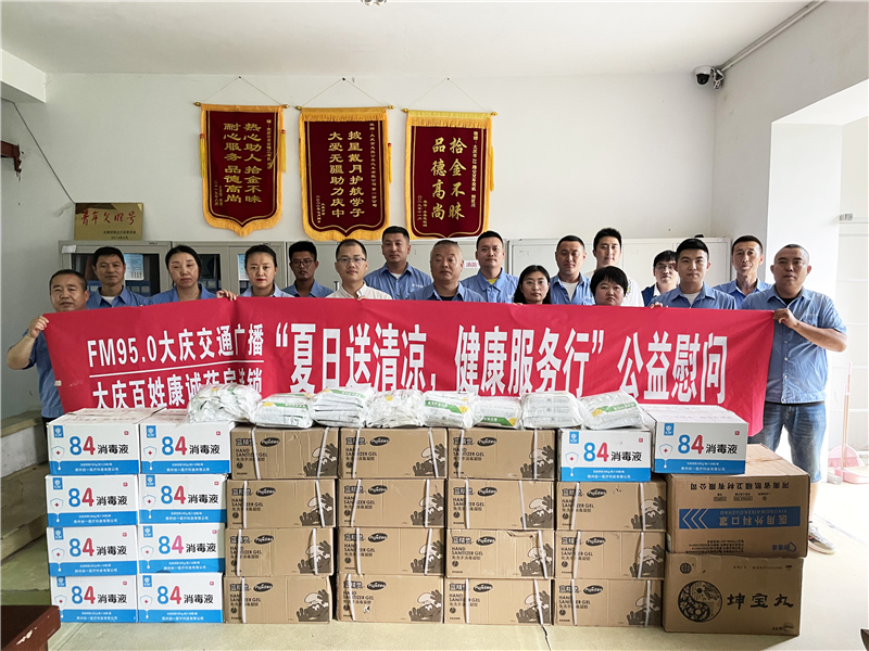 2021年7月百姓康誠藥房攜手FM95.0大慶交通廣播“夏日送清涼,健康服務行”公益慰問第二站,向大慶公交公司捐贈84消毒液、醫(yī)用外科口罩、免洗消毒凝膠、夏日避暑藥品等物資。