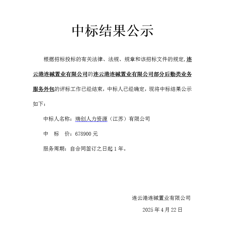 連云港連堿置業(yè)有限公司部分后勤類業(yè)務服務外包中標結(jié)果公示