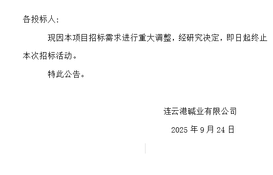 關(guān)于連云港堿業(yè)有限公司化工輔料甲醇采購終止招標(biāo)的公告