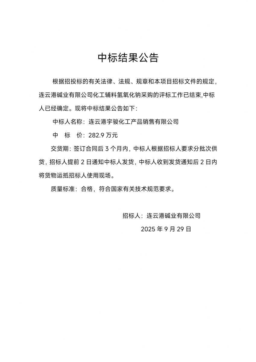 連云港堿業(yè)有限公司化工輔料氫氧化鈉采購中標(biāo)結(jié)果公告