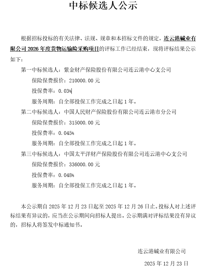連云港堿業(yè)有限公司2026年度貨物運輸險采購項目中標(biāo)候選人公示