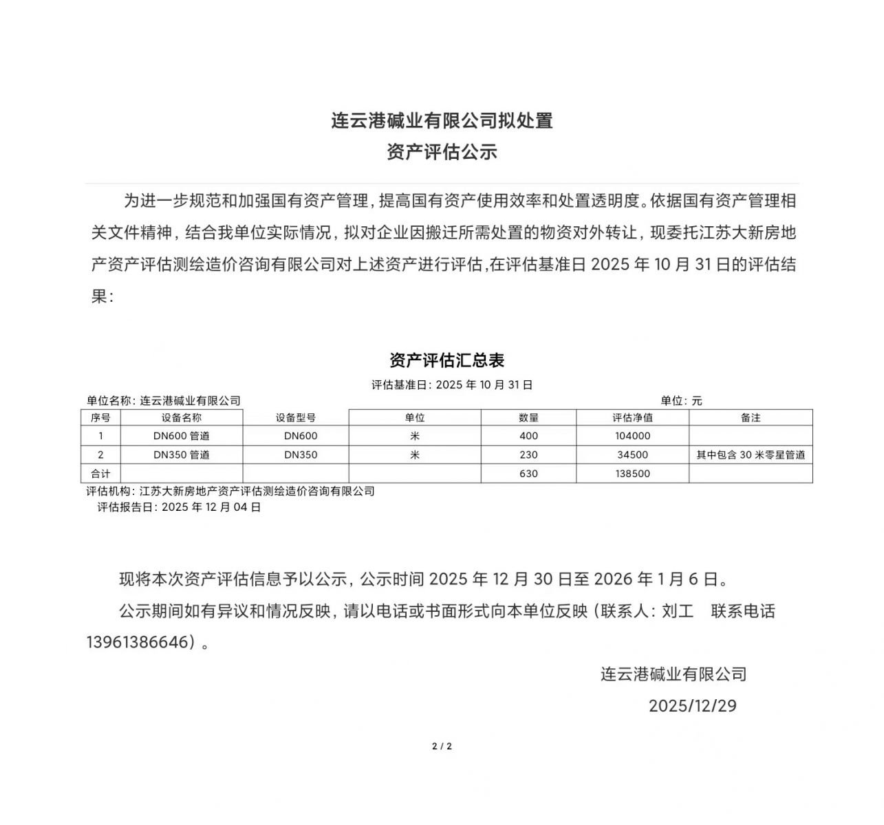 連云港堿業(yè)有限公司老廠區(qū)報廢管道設(shè)備資產(chǎn)評估公示
