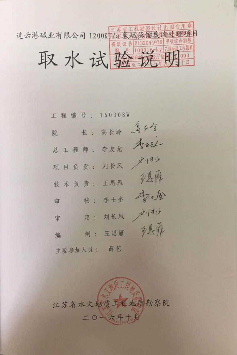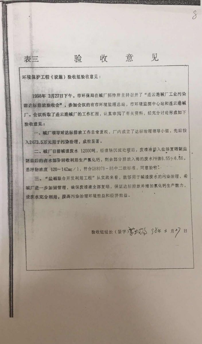 根據(jù)吉林化學(xué)工業(yè)公司設(shè)計(jì)院《連云港堿廠環(huán)境影響報(bào)告書》和原江蘇省環(huán)境保護(hù)局《關(guān)于對(duì)連云港堿廠環(huán)境影響報(bào)告書的批復(fù)》(蘇環(huán)管〔86〕31號(hào))的要求,連云港堿廠產(chǎn)生的廢液送至渣場(chǎng),經(jīng)澄清后,上清液經(jīng)自有排口閘直接排海。1997年,根據(jù)淮河流域水污染防治的要求,連云港市環(huán)保局向連云港堿廠下達(dá)了《關(guān)于淮河流域水污染源限期達(dá)標(biāo)排放的決定》(連環(huán)管〔1997〕16號(hào))。據(jù)此,連云港堿廠與臺(tái)北鹽場(chǎng)合作開發(fā)了“堿渣場(chǎng)上清液回收利用工程”項(xiàng)目,利用上清液制鹽、制鈣。1998年3月27日,該項(xiàng)目通過連云港市環(huán)保局組織的環(huán)保驗(yàn)收,正式運(yùn)行。