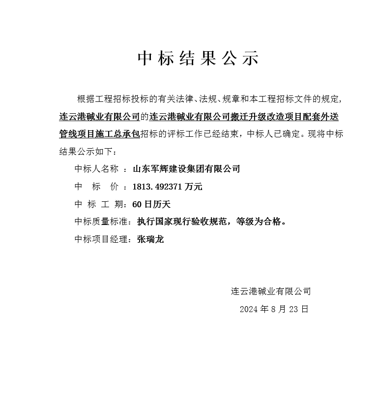 搬遷升級改造項目配套外送管線項目中標(biāo)結(jié)果公示