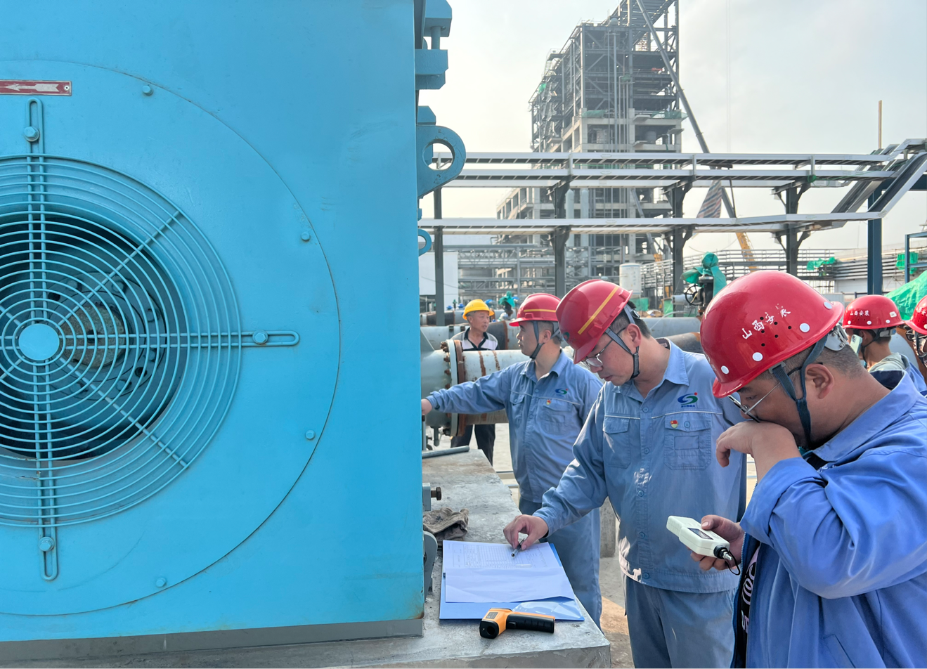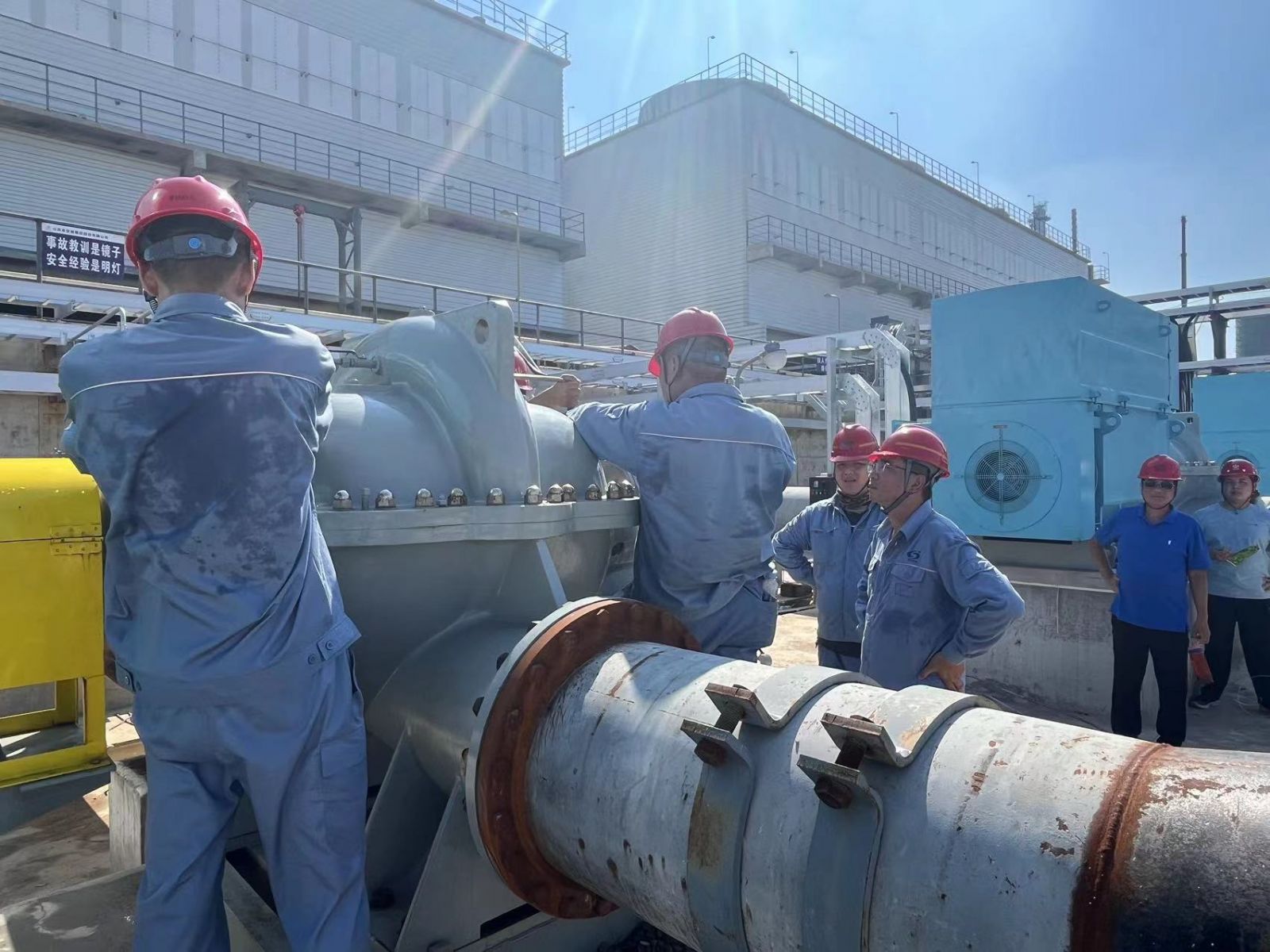 上午11:28,伴隨著“具備條件,啟動(dòng)電機(jī)”指令的發(fā)出,操作人員按下空分循環(huán)水泵P820101A“啟動(dòng)”開關(guān),電機(jī)開始高速旋轉(zhuǎn),隨后操作人員依次開啟P820101B、C??辗盅h(huán)水泵單機(jī)試車的現(xiàn)場(chǎng)“熱辣滾燙”,大家衣衫被汗水濕透,但熱情依舊高漲。操作人員每隔15分鐘就詳細(xì)檢查記錄電機(jī)的軸溫、轉(zhuǎn)速、振值等指標(biāo)。