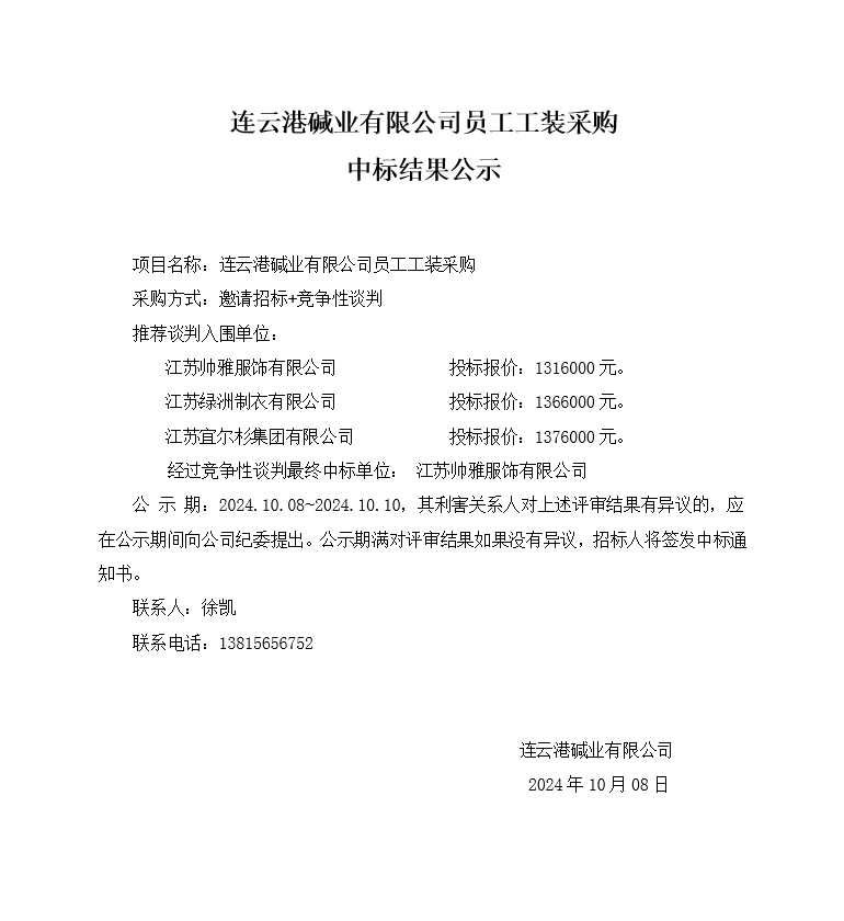 連云港堿業(yè)有限公司員工工裝采購中標(biāo)結(jié)果公示