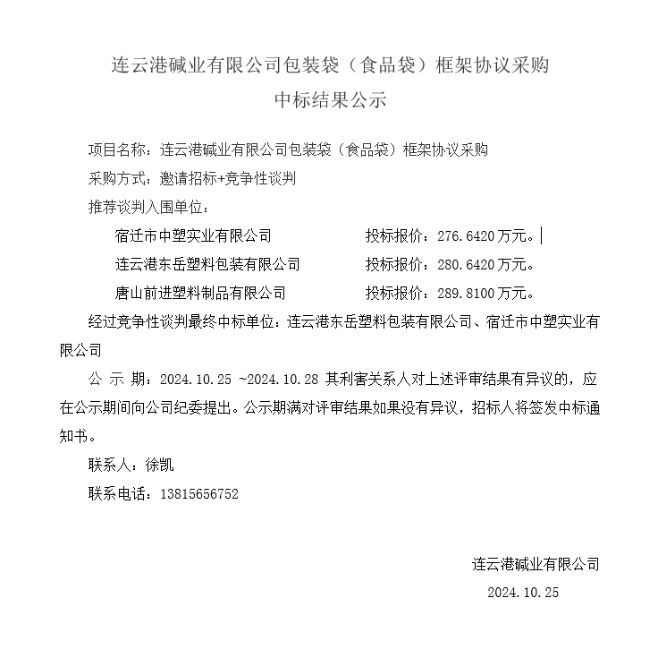 連云港堿業(yè)有限公司包裝袋(食品袋)框架協(xié)議采購中標結果公示